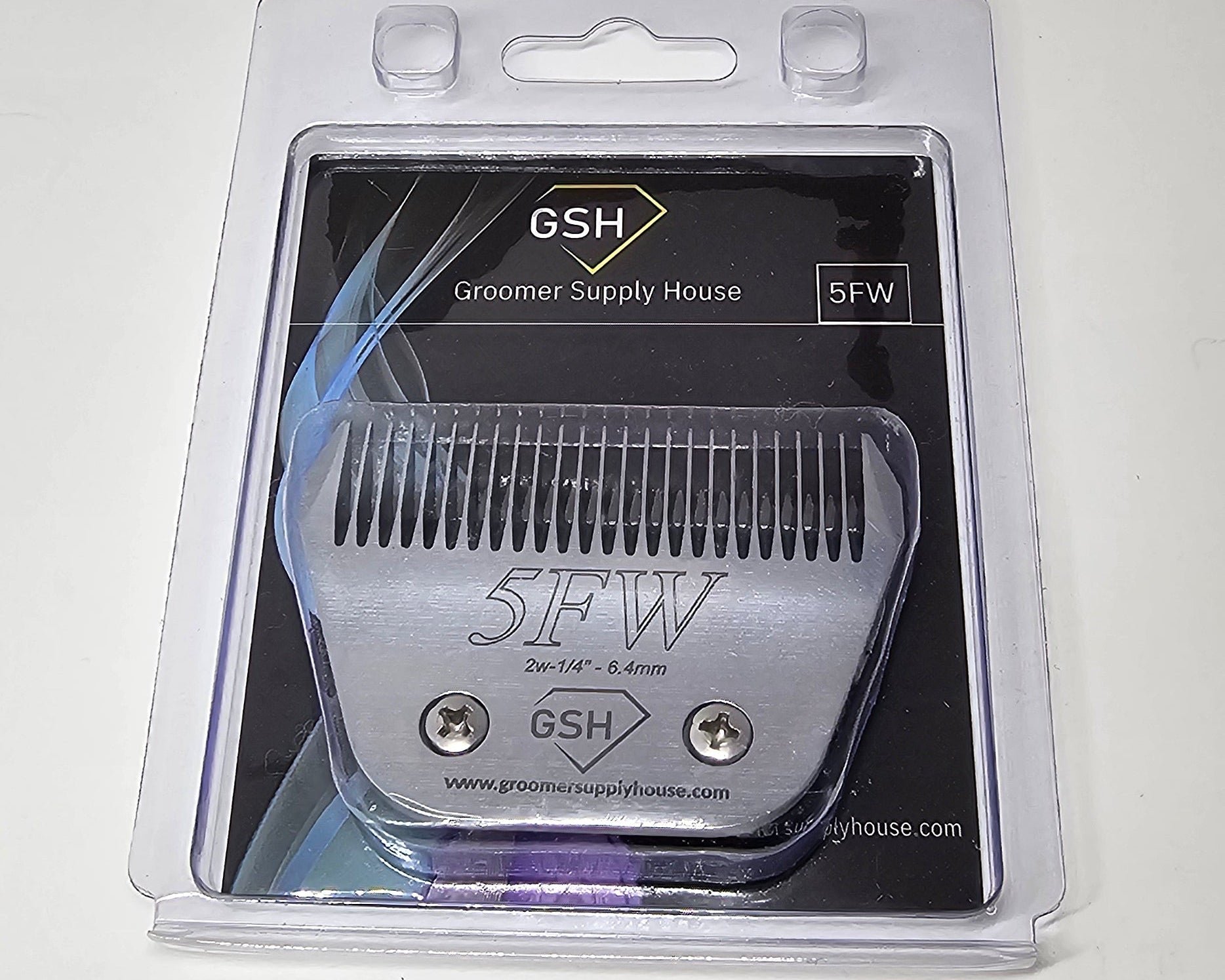 The GSH 5WF wide clipper blade is a professional grade wide cut finishing blade designed for dog grooming which leaves hair about 1/4" (6.4 mm) long. The "F" in the name signifies a "finish cut," meaning all the teeth are the same length for a smooth, even result.
